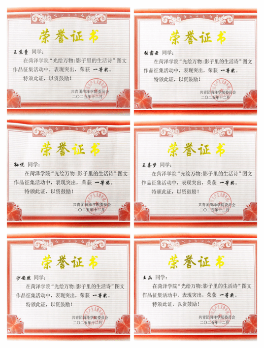 近日,菏泽学院“光绘万物:影子里的生活诗”图文作品征集活动评选结果揭晓,我校学子凭借出色的创作实力斩获多项荣誉,其中6名学生荣获一等奖,7名学生荣获二等奖,7名学生荣获三等奖。