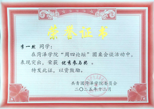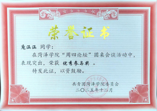 近日,我校学生庞涵涵、李一然在参加菏泽学院周四论坛圆桌会谈活动中,详细介绍了单县分校周四论坛的实施步骤、参与情况及实际成效,凭借对分校周四论坛全程高效的统筹协调、细致周全的筹备执行,荣获优秀参与奖。
