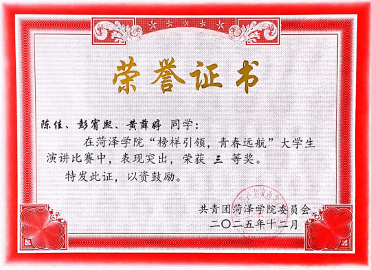 12月21日,菏泽学院“榜样引领 青春远航”大学生演讲比赛决赛顺利举行,单县分校三位选手凭借出色表现荣获三等奖。